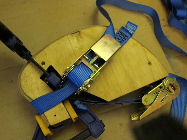 • Mediante abrazaderas y correas del trinquete que hice un par seco corre a trabajar en los mejores lugares para sujetar la madera a la forma...