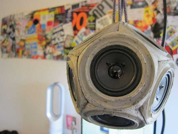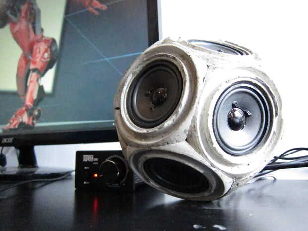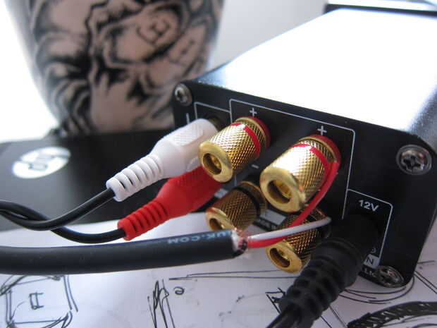 Ejecutar 3,5 mm a cable RCA desde mi portatil a un amplificador de escritorio (Musa M50). Y conecte el extremo libre del cable de altavoz desde el dodecaedro a la salida del canal derecho del amplificador.