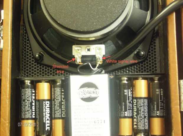 Todas las baterías Retire el Pignose. Cuidadosamente desoldar los dos cables del altavoz, se refieren a la foto. Tenga en cuenta que el cable blanco esté conectado al terminal marcado con un punto rojo. Consideraremos este positivo (+) terminal. La otra terminal se suelda a la pantalla del cable, así que esto debe ser tierra.