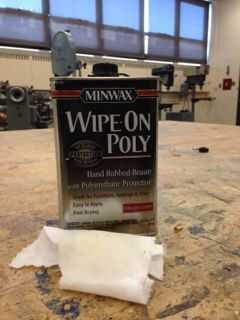 No el último de su lijado del altavoz y asegúrese de que todo el polvo es de él. Haz wipe-poly para limpiar la madera. Me gusta el acabado de brillo pero es preferencia personal. Usted probablemente tendrá que hacer varias capas, esperando al menos 30 minutos a una hora entre capas. Espere hasta que esté completamente seca.
