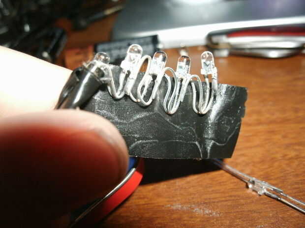 primero se necesitan cerca de cinco leds para un circuito paralelo y doble entonces como en la foto.