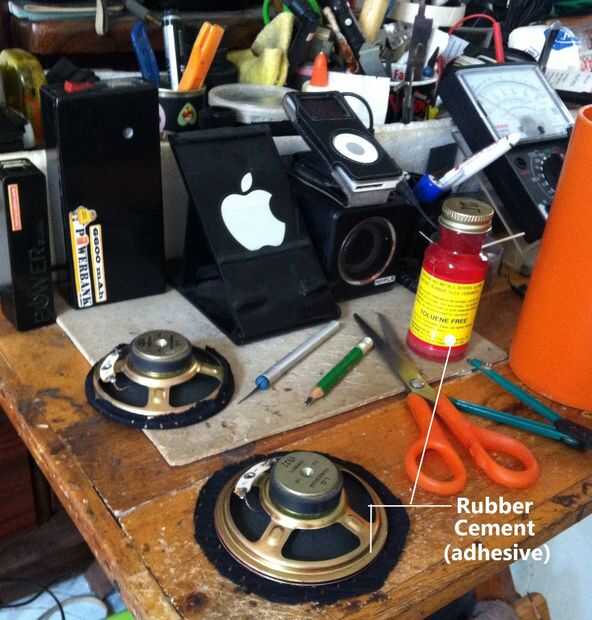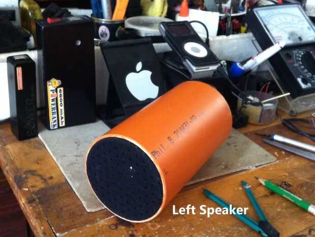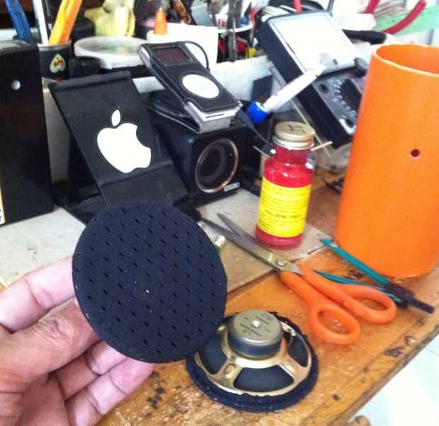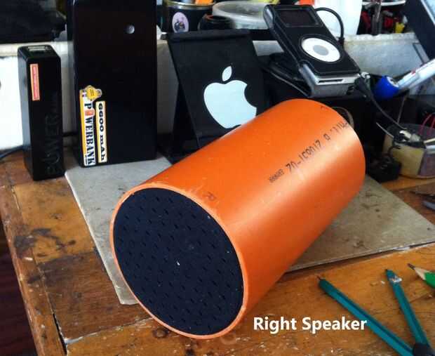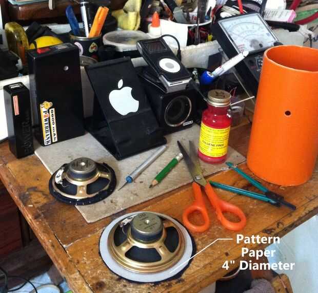 Corte por lo menos 6 pulgadas de largo de tubo de PVC para el altavoz de la vivienda. Y preparar el altavoz ajuste derecha primero en PVC y probar los altavoces. Si funcionan los dos altavoces, llega el momento asegurado el altavoz por poner algunas parrillas en él. Puede utilizar variedad de materiales para proteger los altavoces. Puede usar las medias de dama o malla de alambre de metal. Usé mi tela jersey surtido para los cascos que he realizado en proyectos anteriores.
