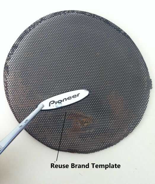 Terminé añadiendo algunos cosméticos rociando con pintura negro metalizado., y añadiendo alguna plantilla de la marca de mi antigua parrilla del altavoz seguí. (como se ve en la imagen).