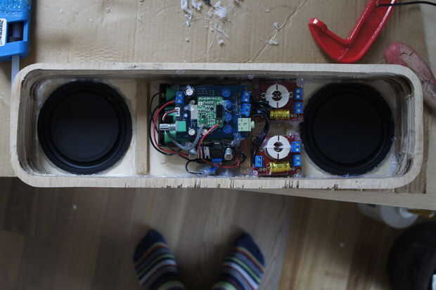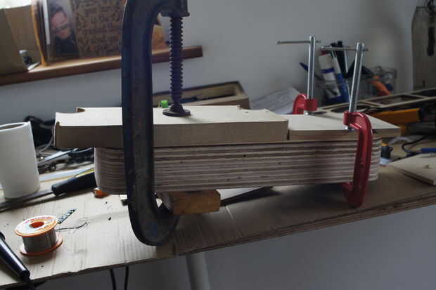 Ahora es el momento para pegar en el panel lateral. Poner una línea de pegamento para madera alrededor del borde del panel posterior y luego fije con abrazaderas el panel lateral de.