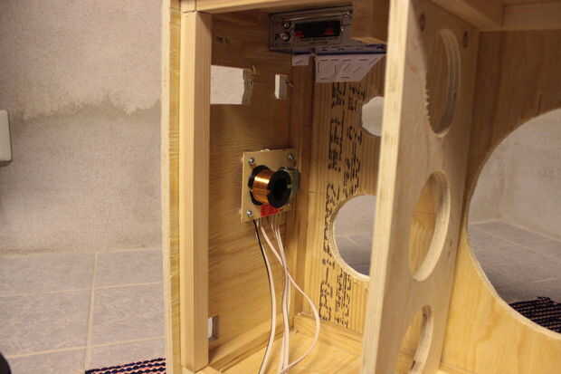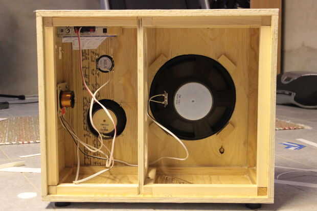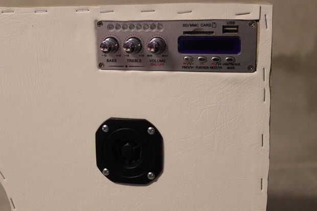 Ahora tenemos que poner todo en su lugar y empecé con el amplificador. Era muy escaso, pero quería que atornillar a la caja por lo que os adjunto un trozo de madera dentro de la caja (ver foto) con tornillos, lo hice antes de que pegué en el cuero artificial.