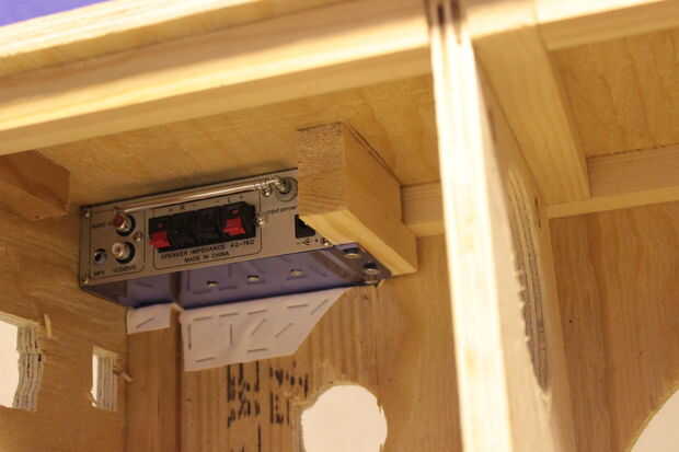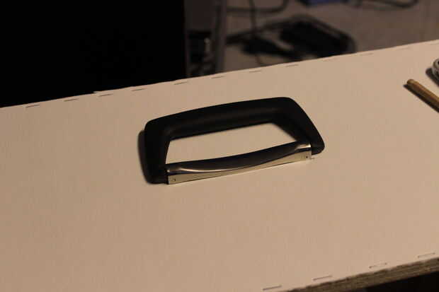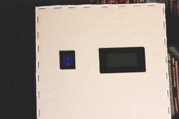 Se colocó un botón y un voltímetro en los agujeros que hice. Sólo corta una "X" en la piel, poner pegamento en la piel y presiona el voltímetro, botón y una entrada de CA que no se muestran en el cuadro. Tan sólo pega el cuero a la caja y no los componentes por lo que podía quitar más adelante si es necesario.