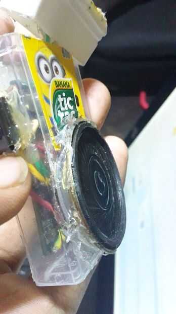 Coloque el altavoz en la parte delantera de la caja de tic tac y pegamento, como se muestra en la imagen de todas las partes del altavoz.