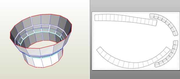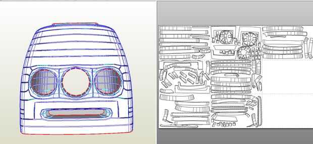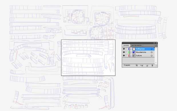 el proceso es importar el modelo 3d a Pepakura, use pepakura para revelar y separar el modelo de patrones de papel. Una vez arreglado para adaptarse a la cama del corte del patrón. exportar a DXF y luego abrir en illustrator, asignar la línea de corte y la línea de plegado para ajuste LÁSER diferentes. Usé 8-10% de la potencia para cortar, grabar el 2%. primero grabar las líneas de plegado, sin mover el papel, ejecute otro camino para cortar las líneas de corte. Una vez que todo está muy bien cortado, cuidadosamente recoger el papel y empezar a pegarlos juntos.