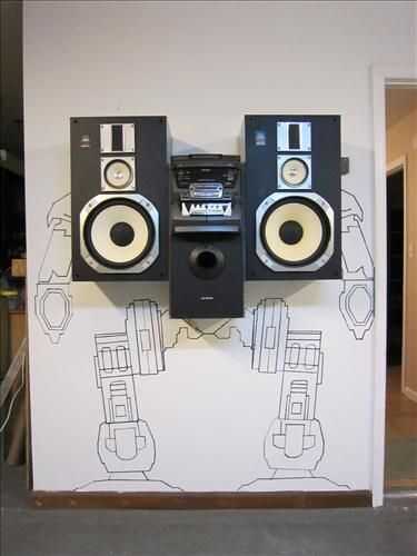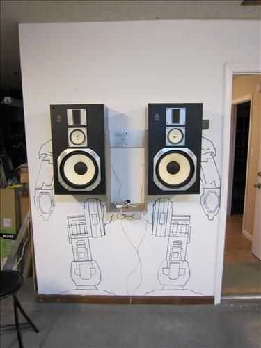 Conectar altavoces a la pared e inserte unidad sub y amplificador. Asegúrese de que al atornillar los altavoces a la pared a golpear el poste que cada altavoz pesa aproximadamente 10 libras.