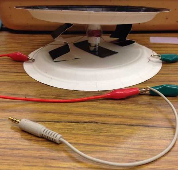 este diseño de altavoz consiste en un recipiente de plástico con tapa, un cable, un tornillo, un imán y que cuando se conecta a una salida de altavoz estéreo de cinta, genera entusiasmo estudiantil y sonido. Esta actividad ilustra fenómenos de magnet