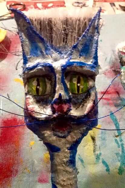 Aplique yeso alrededor del cepillo donde desea la cara y trabajar de manera baja por el cuello del cepillo, decidir si requieren oídos para su proyecto que en este momento entonces oídos tarjeta y cubrían con yeso y colocar a la cabeza, así agregando la cara y dejar secar, en mi caso que opté por sistema en seco con calentamiento / secado herramienta de calor. luego Gesso toda brocha dos capas para hacer una mejor cobertura luego secar o la dejó seca. Después de todo es completamente seco vas a comenzar a pintar, hacer shad y sombras donde sientes que necesitan, así como destacados. Última cosa que añadir es bigotes y pegué abajo con E6000.