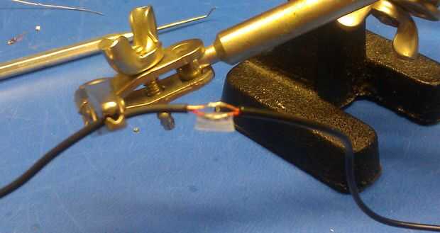 Recomendado: cinta aislante. Usé cinta de celofán scotch. No he podido encontrar ninguna cinta eléctrica en el laboratorio, así que improvisé. En las bajas tensiones de auriculares, funciona bien. Además, se ve bien con el claro utilicé tubería de encogimiento.
