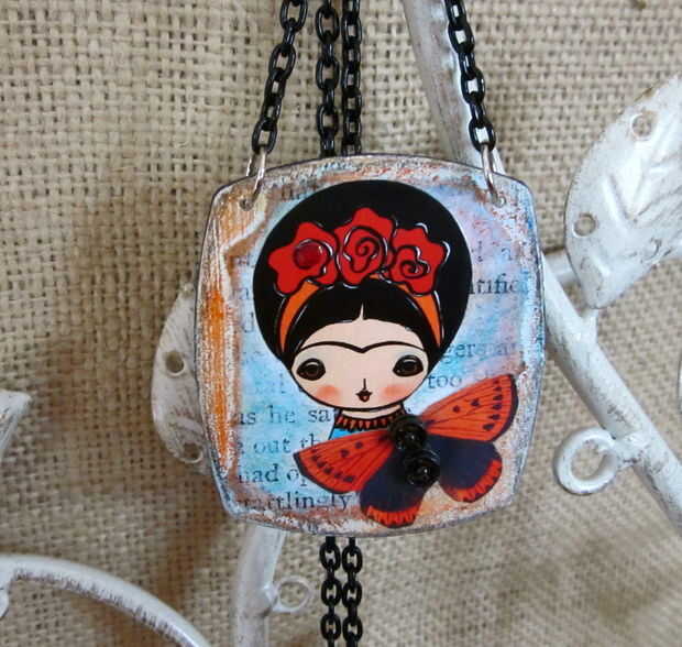 He probado una nueva técnica para el fondo. Utilicé una hoja de papel arrancada de un libro dañado como capa base. Entonces usé gesso, acuarelas crayones y Crayolas viejo llano para dar el fondo de algún color. La imagen de Frida que utilicé es de Dilly Beans. Color Frida con MS Paint y luego dio las mejillas un poco rubor con la tiza. La mariposa es de Dover clipart. El colgante está adornado con dos broches de metal negro y un rhinestone rojo brillante.
