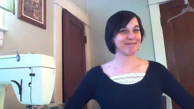 tomé mi camiseta en cerca de dos pulgadas a cada lado. El ajuste es bueno, pero me decidí a coser en un pequeño panel de cordón del estiramiento para que el escote era un poco más modesto. ¡ Felicidades! Tienes una camisa que se adapte!