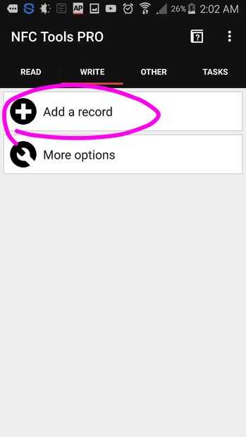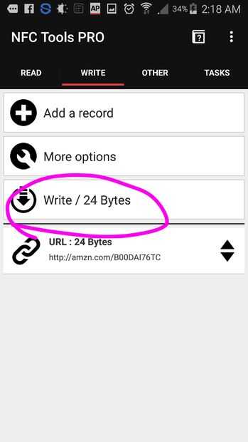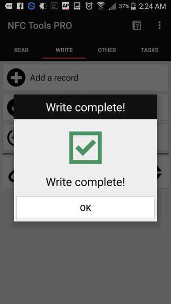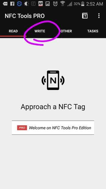 La aplicación ahora le preguntará a la etiqueta NFC para escribir datos en él. Toque la parte posterior del teléfono directamente a la etiqueta y mantenerlo quieto por un par de segundos. Puede ser necesario retirar su caso teléfono o qi carga shell con el fin de permitir la comunicación del campo magnético.