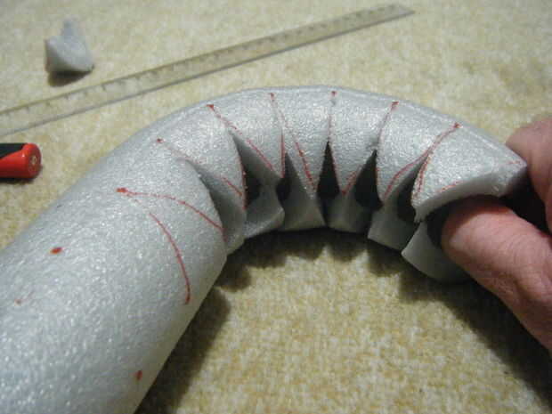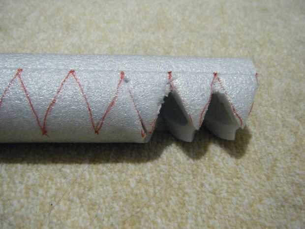 La primera foto es mucho más clara que la descripción tan mire que antes de leer en. En primer lugar, dibuje una línea recta el aislamiento. Dibuje otra línea de 90 grados (1/4 del círculo) de la primera. El material para retirar será triángulos equiláteros con una base que es el radio, r (es decir, 1/2 del diámetro) del diámetro exterior del aislamiento. Para ello, utilice una regla para colocar una marca cada centímetros de r a lo largo de una de las líneas. Lo mismo para la otra línea, excepto cambio de cada marca por 1/2 r (es decir, 1/4 del D.E.). Continuación, conecte los puntos para hacer triángulos.