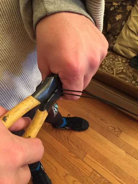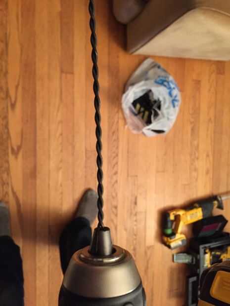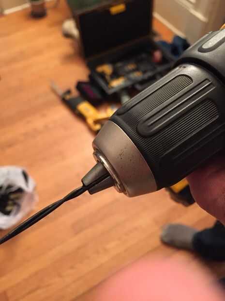 En segundo lugar hicimos las "barras" para colgar nuestro disco. Lo hicimos tomando múltiples filamentos de embalar (diversas longitudes para diferentes secciones del árbol), sosteniendo un extremo de alambre de enfardar con el juez de línea pinzas y el otro extremo del alambre de enfardar en un taladro de arrojamiento. ** Por favor tenga cuidado, esto podría ser peligroso! ** Es importante para la persona que sostiene los extremos de los filamentos del rescate de alambre con los alicates para mantener la tensión mientras que la otra persona funciona el taladro. Funciona el taladro lentamente no tiene mucha velocidad. Como ejecutar el taladro usted notará el cable achique torsión uniformemente. Encontramos que necesitábamos 3 a 4 corridas de alambre en cada sección retorcida para que sea bastante fuerte para sostener nuestro disco de rescate. Barras de un neumático se hicieron, limpiarlos con un trapo, como estaban bastante sucias (alambre de enfardar viene cubierto en aceite para evitar que se oxide).