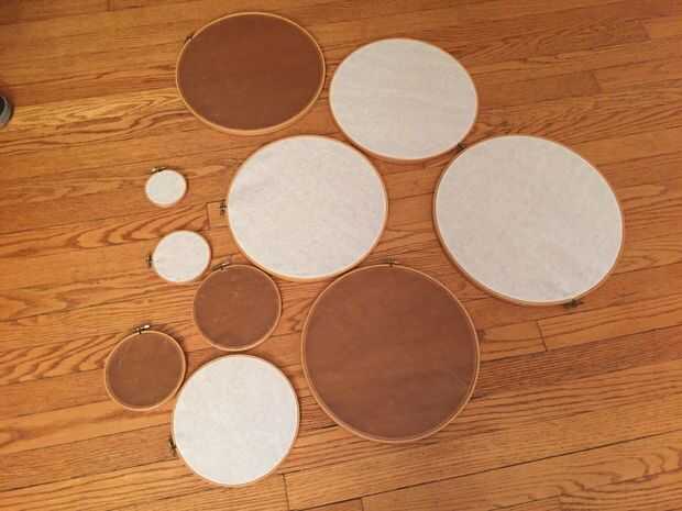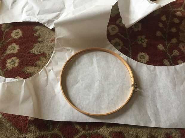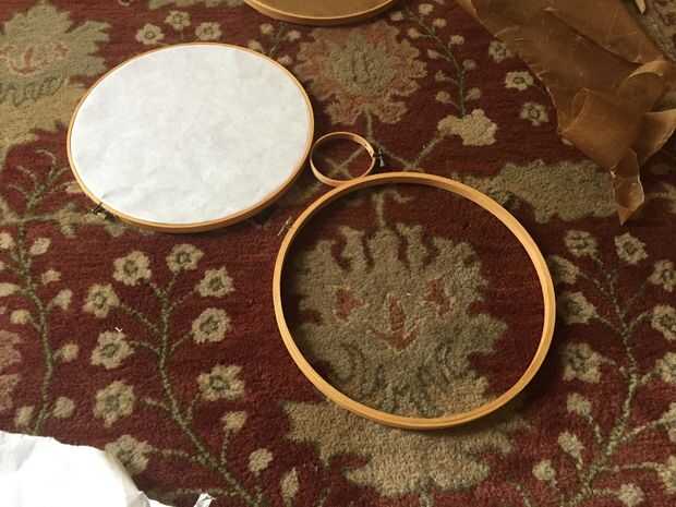 Primero ponemos el papel en los aros de bordado. Contamos con rollos grandes de papel de estraza y papel de cera por parte por lo que decidimos en. También habíamos considerado usando algún tipo de brillantes de oro y plata tela. Nosotros sobre tamaño de las piezas, que nos permitieron obtener paneles lisos firmemente dentro de los aros. una vez que fue instalado el papel cortamos el exceso de con una navaja. Hicimos unos aros de papel de carnicero 50/50 y a la cera