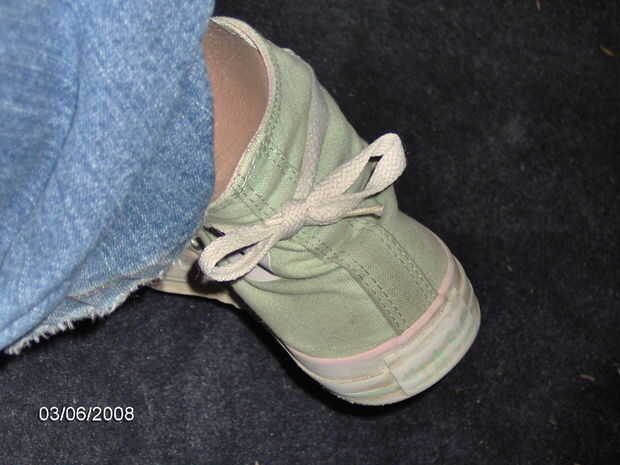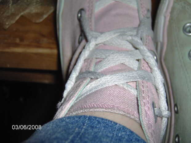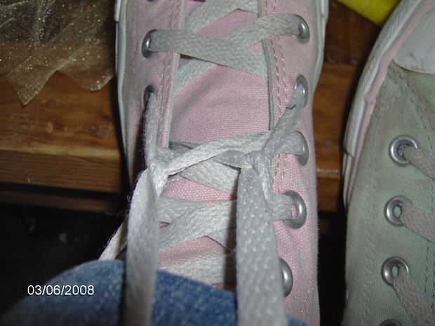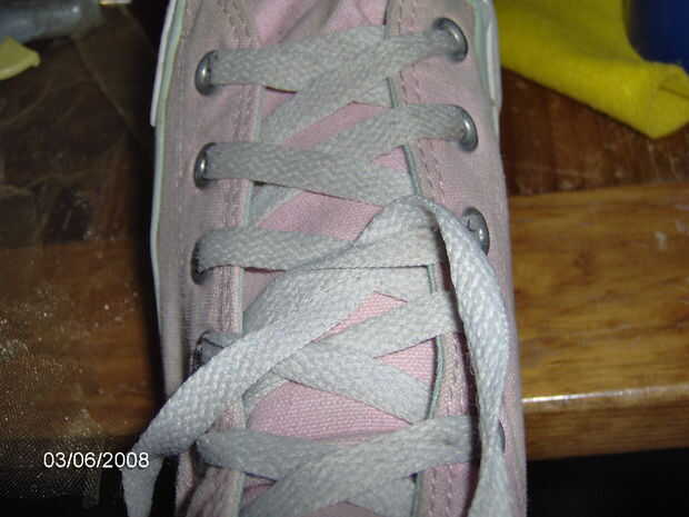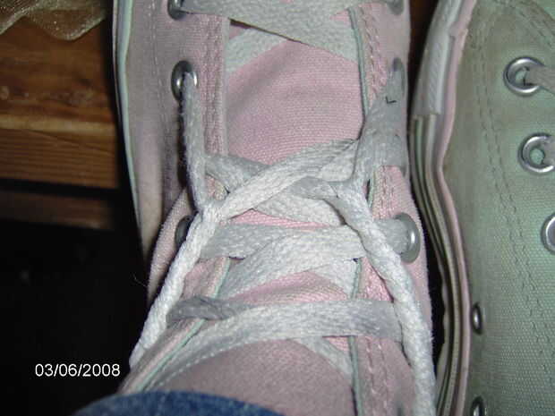 En primer lugar, tomar ambos cordones y ponerla a través en cruz cordones un poco más a mitad de camino hasta el zapato.