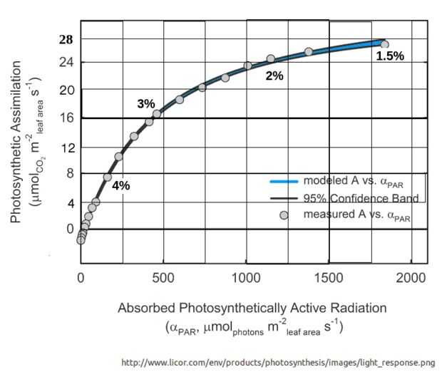 Así podemos ver que las plantas crecen más con más luz, pero no linealmente. Hay rendimientos decrecientes. Esto sugiere que para una cantidad dada de energía de la luz: 1) un mayor "día solar" (como luz artificial) mejora el crecimiento y la eficiencia, y 2) que es mejor con la difusa luz que ilumina el follaje uniformemente, en lugar de desigual, por ejemplo donde hay mayor intensidad de luz en las hojas superiores y menor intensidad en baja-hojas (por ejemplo a partir del sombreado de maleza).