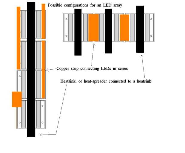 La imagen muestra un ejemplo de la disposición del PWB para las conexiones eléctricas y los requisitos de disipador de calor para una matriz de LED. Aquí el LED es un paquete de componente Cree XLamp. Hay una ventaja a la configuración a la izquierda, donde el disipador de calor puede ser una sola pieza continua. Considerando por un momento que la posibilidad de "construir-de-scratch", posiblemente este disipador solo loco podría incluso ser una pieza de chapa de aluminio, suponiendo que hubo una buena manera de montar mecánicamente y asegure las piezas. No tengo una buena forma de hacerlo en mi sótano, así que por ahora lo MCPCB de estándar de la industria es preferido, porque maneja los cables y la transferencia de calor en un sólido montaje mecánico.