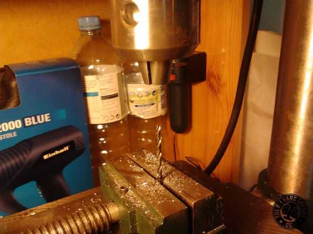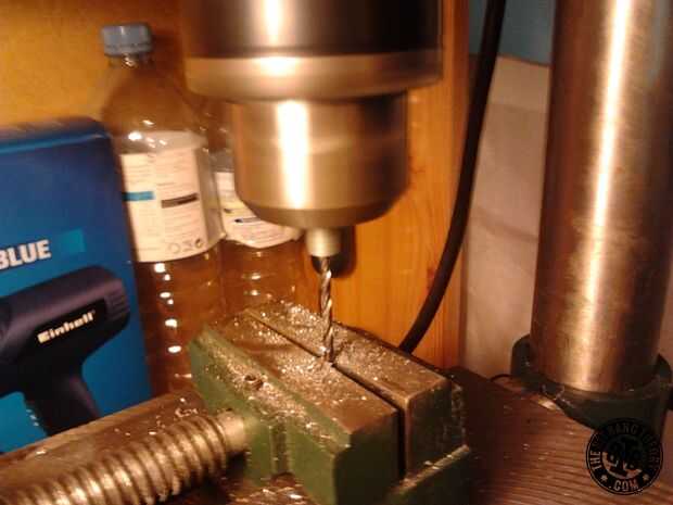 Lo primero que tienes que hacer después de cortar el pedazo de varilla roscada con el tamaño encuentra apropiado taladrar a través de su centro con un taladro de 3 mm. Sin embargo, el taladro tiene que estar perfectamente alineados, para que la varilla roscada también estará perfectamente alineada con el eje del motor. Para ello utilizo un taladro de banco y un pequeño truco: