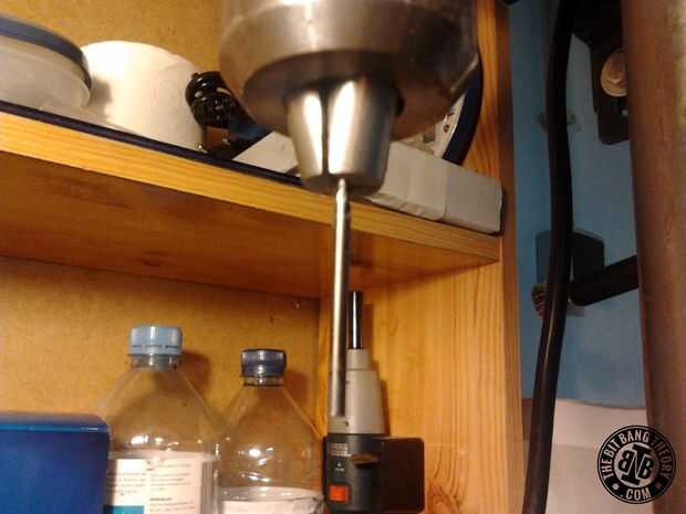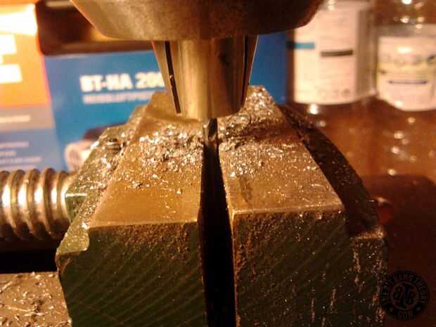 - El pedacito de taladro será ahora inmóvil y perfectamente verticalmente alineado con el mandril y el pedazo de varilla roscada girará sobre la broca cuando se enciende.