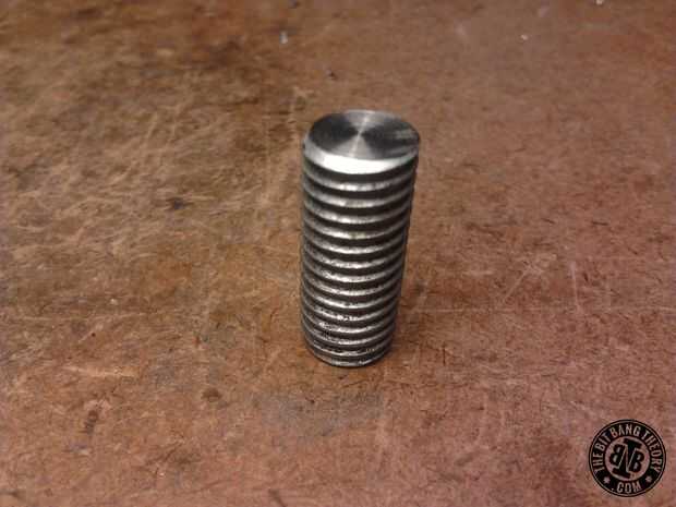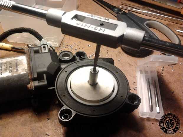 Después de la perforación a través del centro de la varilla roscada, coloque la rueda en el eje y utilice el pedazo perforado de varilla roscada como guía para hacer un orificio en el centro del eje del motor con una perforación de 2,5 mm. Entonces, un grifo de 3 mm conjunto para aprovechar el agujero de 2,5 mm en el eje del motor y para terminar uso un tornillo M3 para fijar la varilla roscada al eje del motor.