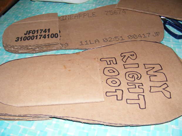 Además pongo un trozo de "caña" de cartón para reforzar el área donde estaría el arco del pie. Esto mantiene la cartulina de doblar demasiado cuando se dobla en uso. O simplemente doble/triple capa la suela entera de los zapatos de payaso.