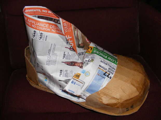 Meter el pie en el zapato y envuelva el papel alrededor de él para ver lo que tenemos.