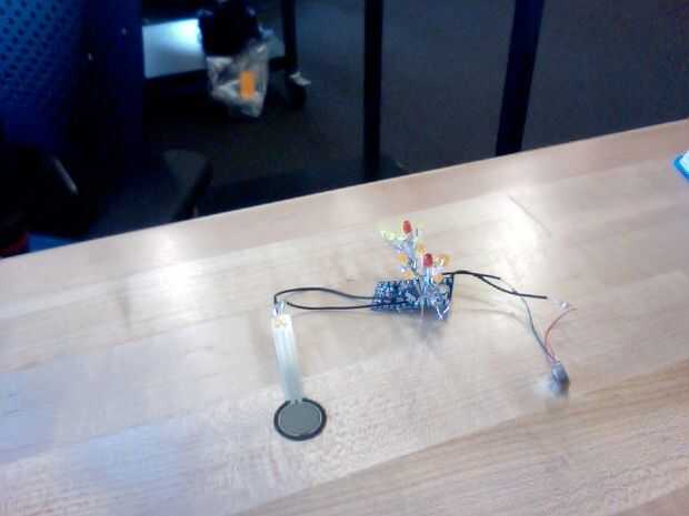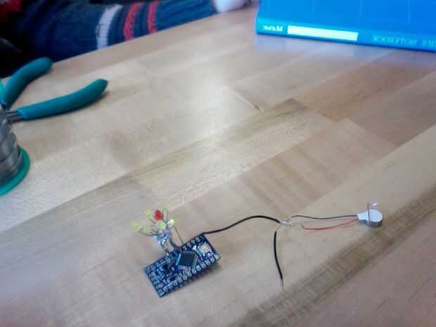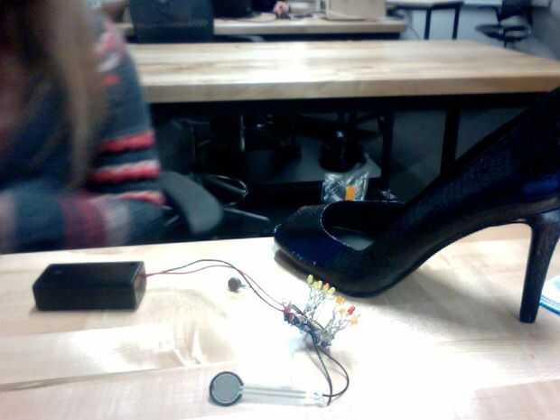 yo primero soldar los LEDs de 2 flores en el Arduino Pro Mini 3.3V. Luego que soldados de la fuerza de sensor y la vibración del motor en el arduino. El sensor de fuerza conectado a VCC y A2. El motor de vibración conectado al pin9 y tierra. Los pétalos de la flor conexión a sus números de pin (2-5, 10-13) y la tierra. A continuación soldar una conexión para el USB FTDI TTL-232R-3V3 - nivel Serial Converter Cable TTL que sería cargar mi codigo de mi portátil en el arduino. Arduino está conectado a una batería de 9V a través de la soldadura es adjunto a continuación en la parte inferior trasera del talón.