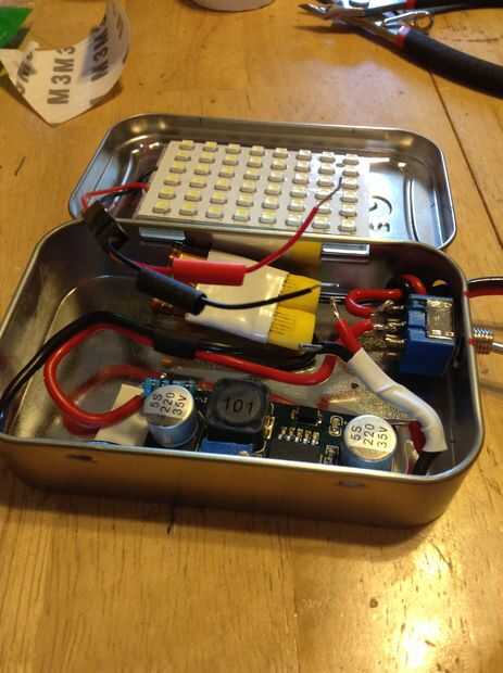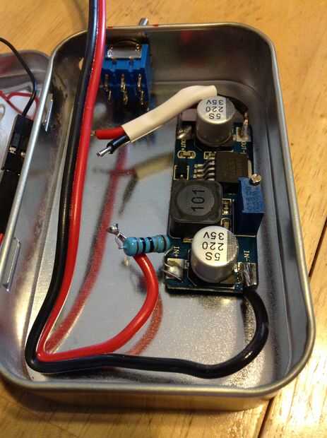 Antes de hacer cualquier otra cosa estar dispuestos a poner un trozo de cinta aislante o algún otro aislante bajo el convertidor después de soldar. No quieres corta las conexiones en la placa de circuito en la lata Altoids.