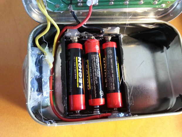6. Coloque el soporte de la batería en la bandeja y asegúrelo con una cantidad abundante de pegamento caliente. También recomiendo poner pegamento sobre las lengüetas que doblada sobre, para evitar que los conectores de batería saltando cuando cambie las baterías.