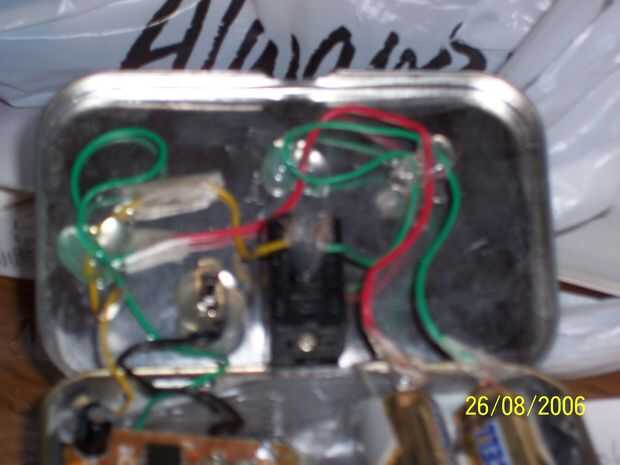 Si eres como yo, te gusta usar un montón de cable extra, por lo que quiere mantener que en la can, caliente pegué mina al interior de la parte superior. También, si tienes un interruptor adicional, como refuerzo de mis bajos, tienes que montar en un montón de cola para evitar hacer contacto con el metal de la caja (esto hará que un disturbio en la fuerza (audio)). Puede que necesite cortar algún metal para hacer el caso abra y cierre suavemente. También, habrá un regulador de volumen en el chip, no se molestan en hacerlo ajustable desde el exterior de la can, pero se puede hacer si usted quiere, usted debe modificas hasta que conseguir el sonido deseado mediante el ajuste del volumen y tono en la guitarra y el volumen de la viruta, algunas combinaciones