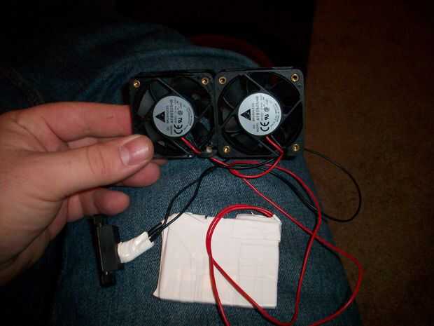 El siguiente paso es unir los dos ventiladores y a conectar todo.  Alambré lado negativo/tierra del ventilador para después interruptor a tierra/negativo de la batería y el lado positivo del ventilador a batería positivo. Terminé volviendo y cortar el alambre para que todo se ajuste en la lata Altoids.