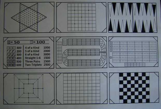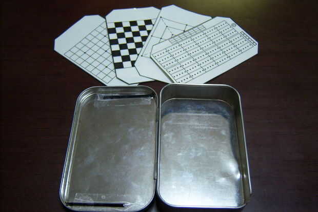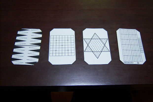 * Fi g. 1 * Imprimir las tarjetas de juego adjuntadas, o dibujar e imprimir su propio. Para mantener los tableros delgados, imprimí mi doble cara (por ejemplo, un lado es un tablero de ajedrez, el otro lado es Backgammon).