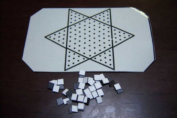 * Pic. 6 * Damas chinas: corté 60 cuadraditos. Una vez que tengo unos buenos marcadores permanentes color a color para diferenciar a los jugadores.