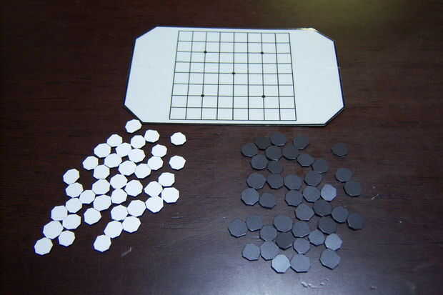 * Fi g. 2 * Go: Un tablero de Go 9 x 9 utiliza 81 piezas, así que corte un 81 octágonos de la hoja magnética. Creo que una perforadora puede haber sido útil aquí. La hoja magnética natural tiene tanto un lado blanco y un negro, para distinguir piezas simplemente volteen. El Backgammon piezas, piezas de Othello, Nine/Twelve hombre Morris y piezas de damas son simplemente un subconjunto de estas 81 piezas de Go.