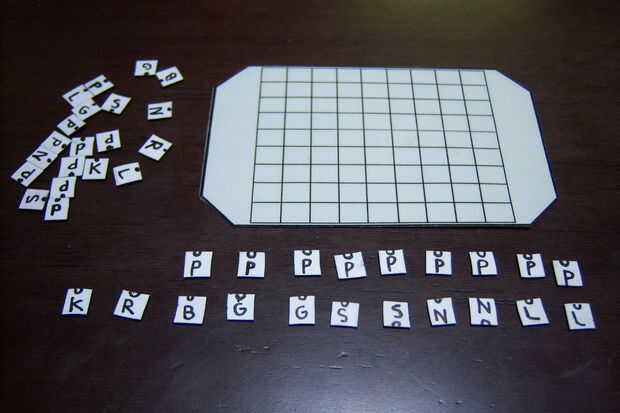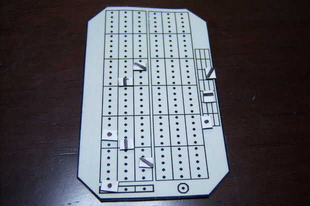* Pic. 7 * Cribbage: 3 jugadores con 3 piezas cada uno = 9 piezas. Usé pequeños rectángulos con símbolos en ellos.