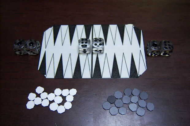 * Fi g. 3 * Backgammon: Sólo 30 de las 81 piezas de Go. Usé los dos dados de Farkel extras para simular un cubo de doblar.