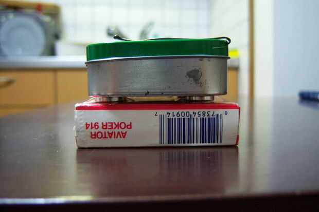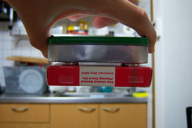 * Pic. 4 * Los imanes son más de lo suficientemente potentes como para sostener las tarjetas a la lata. Sin embargo, porque los imanes se intercalan entre la lata y las cartas, no debe preocuparse demasiado por ellos limpiar sus tarjetas de crédito y similares. Aunque probablemente no pongo mis palillos de la memoria en el mismo bolsillo como esta cosa.