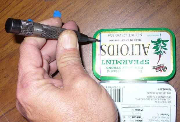 Ahora con la madera de apoyo a la lata, tomar un sacador automático (la herramienta en la mano) y localice la marca y empuje, un resorte en el golpe pone un buen hueco en el lugar a perforar. Sin este paso el taladro puede vagar