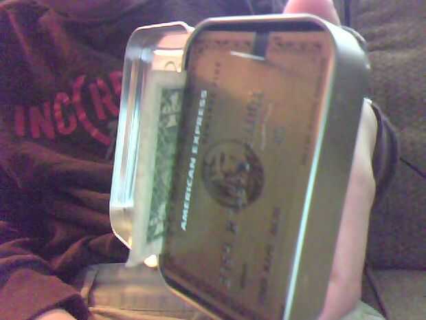 El dinero y lo puso en la lata altoids. Asegúrese de que el dinero se saca cuando se pone la tarjeta de crédito, así que usted puede distribuir su dinero. Tome su tarjeta de crédito falsa y poner en el altoids puede sobre el dinero. Se debe poder apretarse bien en la lata altoids o de lo contrario todo su dinero caerá y algunos hobo robarlo. (Es broma) Puede hacer un corte pequeño en la tarjeta de crédito para que pueda fácilmente sacar la tarjeta de crédito y colocar más dinero en su billetera. (A menos que no tengas más dinero)