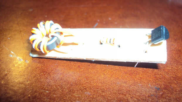 Tomar el otro cable solo de la toroide y suelde con el colector del transistor. Soldar el lado positivo del LED al coleccionista así y suelde el lado negativo para el emisor.