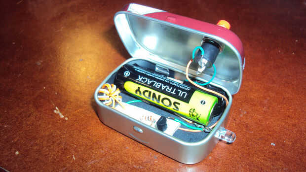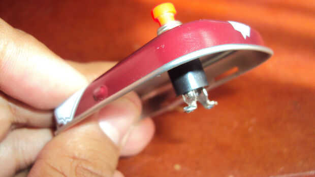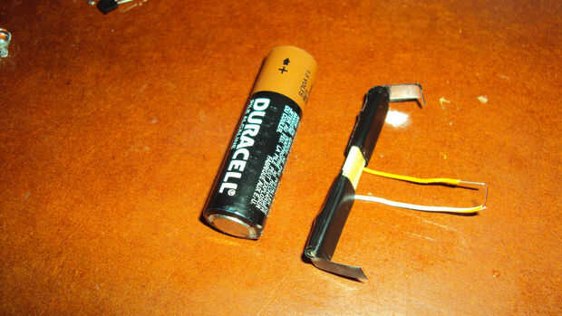 Doble con cuidado las dos patas del interruptor hacia abajo un poco. Tomar un alambre y soldadura que una de las fichas de interruptor. Suelde el otro extremo del cable en el lado positivo de la caja de la batería.