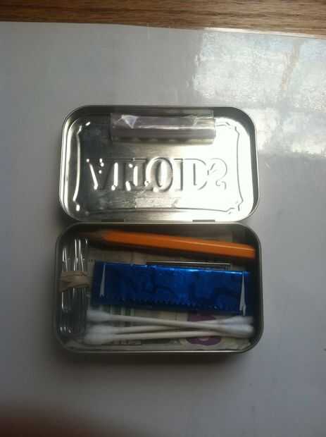 This is my altoids survival kit.Cuenta con:1. papel2. lápiz3. velas de cumpleaños4. té vela5. navaja de bolsillo6. la aguja con hilo7. el espejo8. la luz9. kit de pesca10. la pelusa11. bolsa de piel de topo, aspirina y pilas para la luz12. el silbido