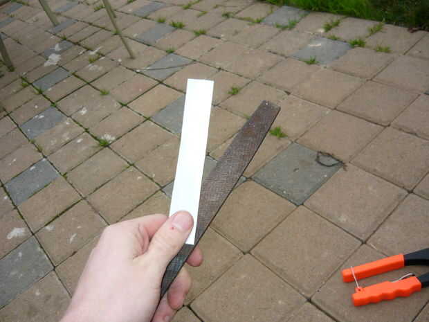 Asegúrese de presentar los bordes!! «Ganchos de los pescados» son delgados láminas de metal que ocurren mientras usted trabaja las tijeras (tijeras) y son muy afilados y puntiagudos. Limar los bordes que ayudan a eliminar estos y ahorrarle el dolor más tarde.