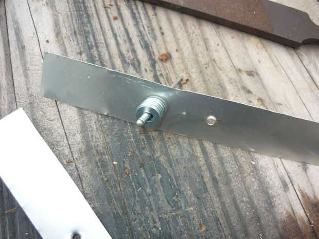4.) añadir otra arandela (utilicé una tuerca de Plaza) en el exterior para mantener el remache de tirar a través de la intermitencia