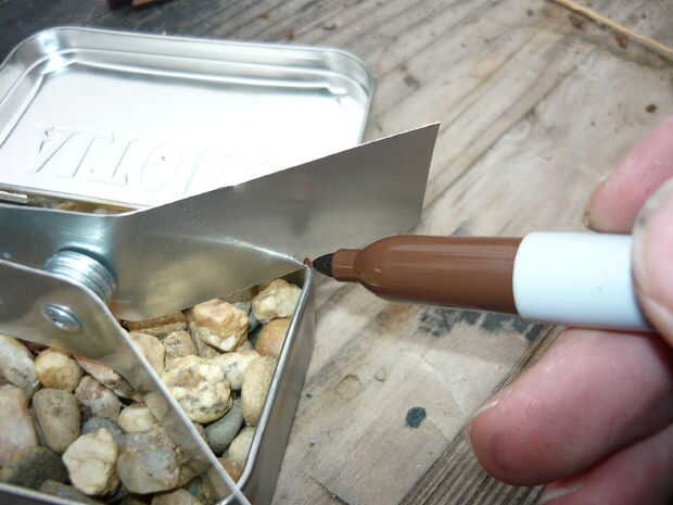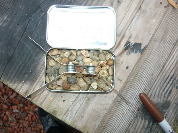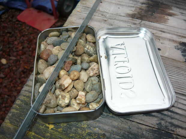3.) con su sierra, corte corto surcos (1/16") en cada punto de esquina de contacto en la lata Altoids y el resto de la olla. Hice mía a profundo, y el resto de la olla se establece en las rocas, esto no es ideal pero funciona.