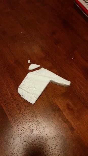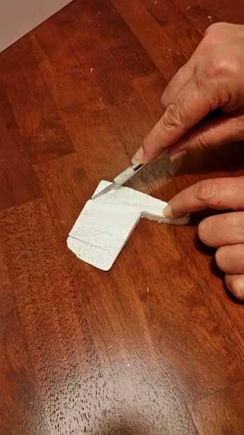 Para hacer la nariz, cortar una esquina del desecho de embalaje de espuma de poliestireno. La pieza debe ser no más de 1/8 de pulgada de ancho, 1 pulgada de largo y 1/2 pulgada en su base. Usted puede hacer la nariz más grande o más pequeño, alrededor de la punta o hacer puntiagudos. Se trata de su preferencia. Personalmente me gusta mi nariz de soldado para hacer la declaración un poco, por lo que tienden a ser un poco grande.